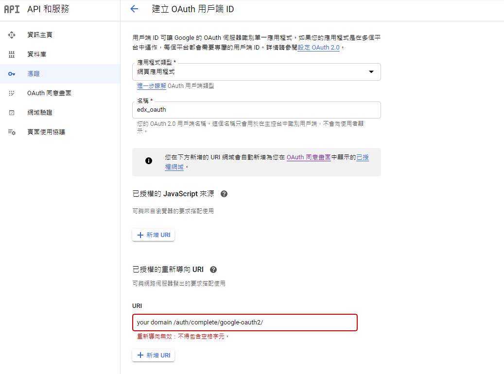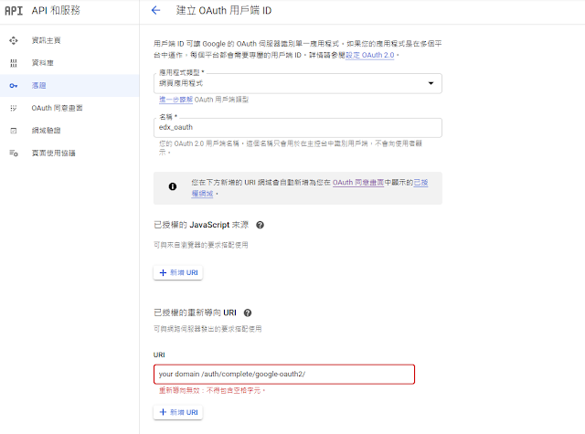 - 已授權的重新導向 URI: [your edx domain]/auth/complete/google-oauth2/