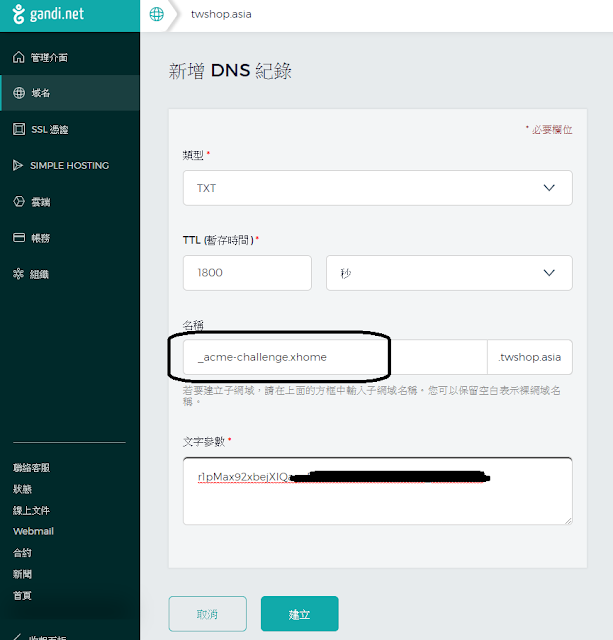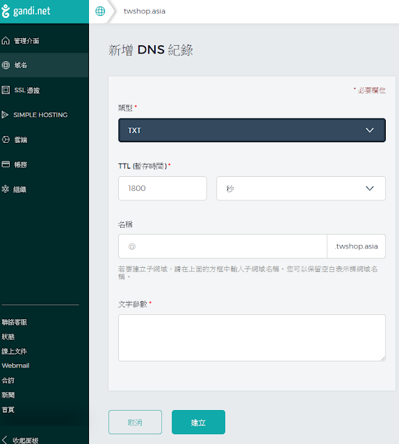 按下Retry Manual Verification得到DNS新增TXT紀錄的資料,