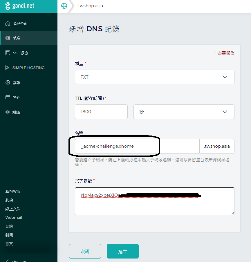 按下Retry Manual Verification得到DNS新增TXT紀錄的資料,