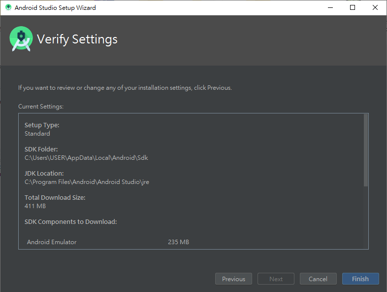 告訴使用者安裝精靈會協助安裝 Android Studio ,