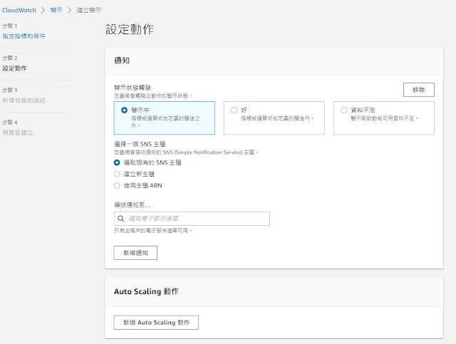 首頁 >> Research >> AWS 雲端運算服務 >> AWS 服務:CloudWatch 警示設定範例
