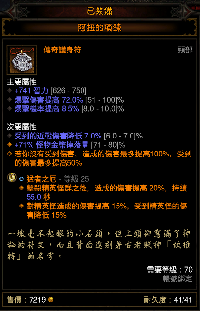 元素嘉年華:增加元素傷害最高至 200 %喬丹之石:以最高的元素增傷作為所有元素的傷害加成阿扭的項鍊:沒受到傷害的時候,最高可增加傷害 100 %