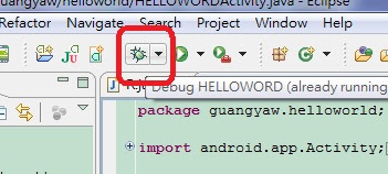 4.按下DEBUG按鈕.就可以在剛才所設定的模擬器上面運行HELLOWORLD